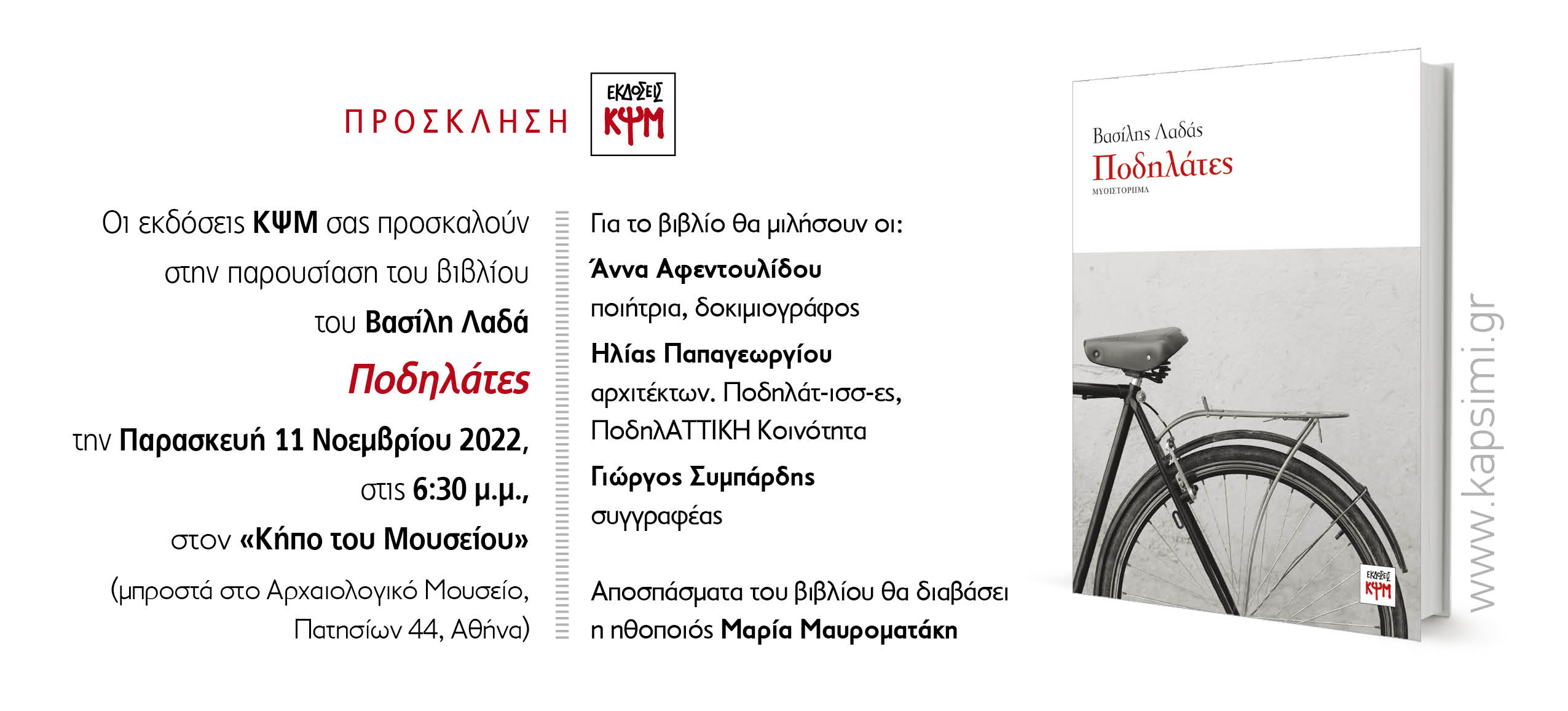 θα γίνει η παρουσίαση του βιβλίου του Βασίλη Λαδά, "Ποδηλάτες"