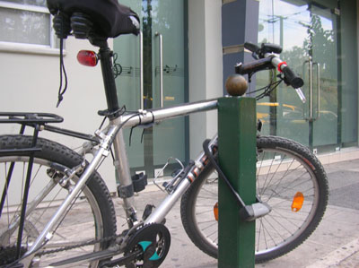 Η νιρβάνα του ποδηλάτη. Επιτέλους το ποδήλατο μας είναι ασφαλές. Και είχα ξελαιμιαστεί να το κοιτάζω από το παράθυρο. (Θεωρούμε δεδομένο ότι πριν το κλειδώσουμε ελέγχουμε ότι η κολώνα δεν κουνιέται και έχει ένα αρκετά μεγάλο σήμα από πάνω ώστε να μην χωράει από πάνω η κλειδαριά μας)