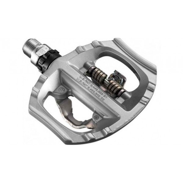 Διπλά, ελαφριά πετάλια 390 γρ. μία όψη πλατφόρμα για συμβατικά παπούτσια και η άλλη κουμπωτή με μηχανισμό ασφάλισης SPD. Μπορούν να χρησιμοποιηθούν τόσο με ποδηλατικά παπούτσια όσο και με κανονικά για Road,Touring,Trekking και για χαλαρή βόλτα και για αποστάσεις. Μαζί με τα σχαράκια και το ειδικό εργαλείο για εξαγωγή πίρου επιθεώρηση λίπανση κτλ. Διατίθενται σε ασημί χρώμα με τα cleats & το εργαλείο εξαγωγής. 35€