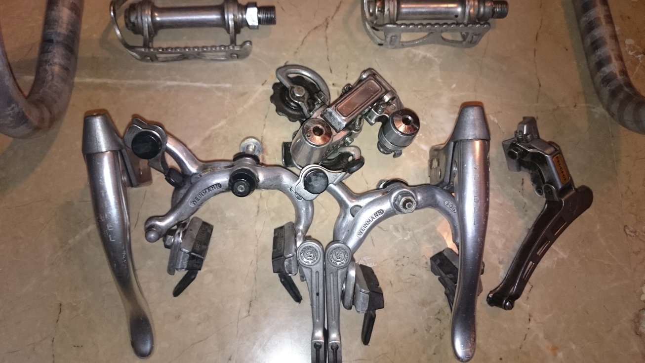 Στην τιμη περιλαμβάνονται : ΟΛΑ ΜΕ ΣΦΡΑΓΙΔΑ ΠΕΖΟ(!!) δισκοβραχίωνας διάτρητος σπανιοτατος με μεσαια τριβη φορεμένο επάνω στο σκελετο, πεταλια της παραγωγης του,2 τροχοι με λαστιχα ετοιμοι για χρηση, φρενα της μανας του, τιμονι της μανας του εξαιρετικο, λεβιεδομανετες, μανετες φρενων, ντεραγιε εμπρος πισω παλουκοσελο με σελα ολα εντελως γνησια πεζο. Προκειται για σπανιοτατο ποδηλατο ετοιμο για δεσιμο. Εχει βαφτεί μαύρο όχι τέλεια χρειάζεται λίγη λεπτομερεια για ολοκλήρωση.Το ποδήλατο δεν ειναι πλεον ασπρο αλλά μαύρο.