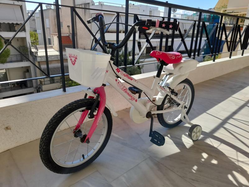 Πωλείται παιδικό ποδήλατο BONANZA BRAVA GIRL 16'', χρώμα λευκό ροζ με βοηθητικές ρόδες, καλάθι στο τιμόνι και θήκη μεταφοράς στο πίσω μέρος. Τιμή 60 ευρώ.