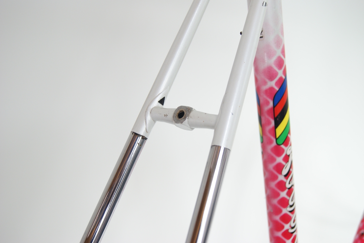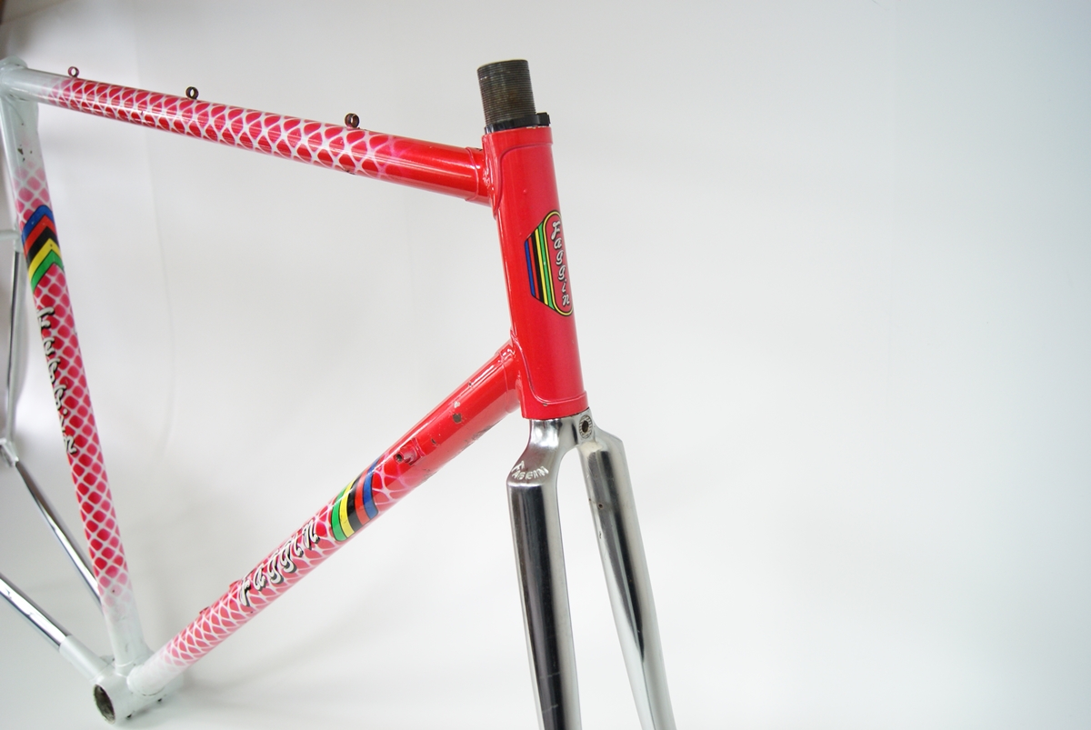 Σχετικά με την ποιότητα του πλαισίου σίγουρα είναι χειροποίητο πολύ καλής ποιότητας κατασκευής, ανεξάρτητα από σετ σωλήνων. Πρέπει να είναι Columbus Tretubi, δηλαδή 3 κύριοι σωλήνες Columbus SL. Αν τα "κάθετα" ψαλίδια έχουν μεταβαλλόμενη εξωτερική διάμετρο, όπως μάλλον φαίνονται στις φωτογραφίες, αυτό είναι ακόμη ένα "συν" στην ποιότητα. Μια-δύο φωτογραφίες της μούφας της μεσαίας τριβής θα διαφωτίσουν αν είναι χυτή ή πρεσσαριστή. Από τα μέσα του'80 και μπρος στα SL και SLX πλαίσια, ήταν μονοκόμματη χυτή η γέφυρα του φρένου, κάπως πλακέ τα σκέλη του πιρουνιού από την κορώνα έως και τη μέση και τα νύχια Campagnolo.
