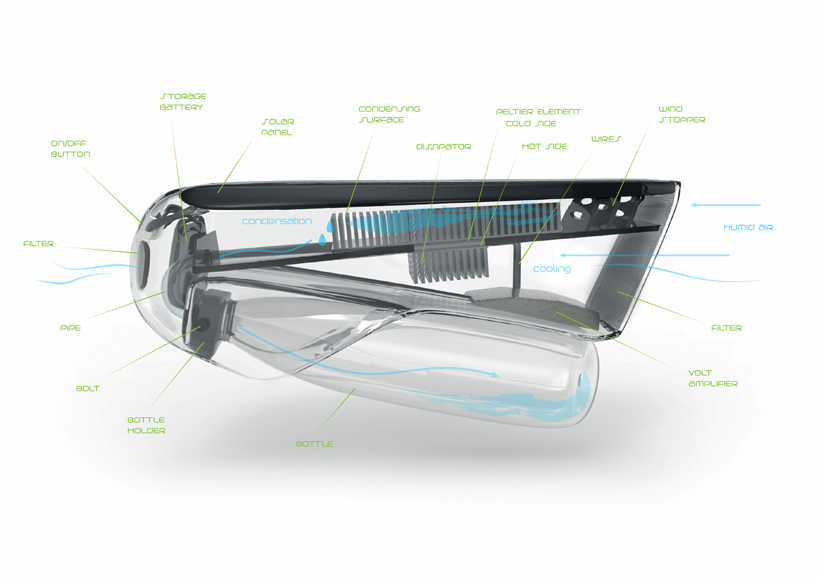 Fontus is a self-filling water bottle for your bicycle. This device collects the moisture contained in the air, condenses it and stores it as safe drinking water. Powered by solar cells, it can harvest up to 0,5 l water in an hour´s time under the right climatic conditions.