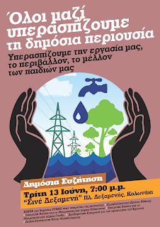 Με πρόσχημα την εξυπηρέτηση ενός άδικου και μη βιώσιμου χρέους προωθείται μια εκτεταμένη και γενικευμένη ιδιωτικοποίηση - εκποίηση περιβαλλοντικού πλούτου και φυσικών πόρων στερώντας από τη χώρα και τους εργαζόμενους τα πολυτιμότερα εργαλεία για τη χάραξη ενός σχεδιασμού παραγωγικής ανασυγκρότησης για την έξοδο από την κρίση, προς όφελος της μεγάλης κοινωνικής πλειοψηφίας.