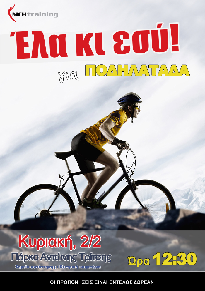 Η ομάδα της MCH Training με τη δράση ΕΛΑ ΚΙ ΕΣΥ δίνει ενα ξεχωριστό ραντεβού αυτή τη φορά στο περιβαλλοντολογικό πάρκο Αντώνης Τρίτσης. Η ποδηλατάδα θα ξεκινήσει στις 12:30 ημέρα Κυριακή 2 Φεβρουαρίου ενώ θα υπάρχει ομάδα εξειδικευμένων ανθρώπων spinning instructors. Με μεγάλη μας χαρά καλούμε όλους εσάς που έχετε αγάπη για το ποδήλατο να μεγαλώσουμε την ομάδα μας και να ποδηλατήσουμε.