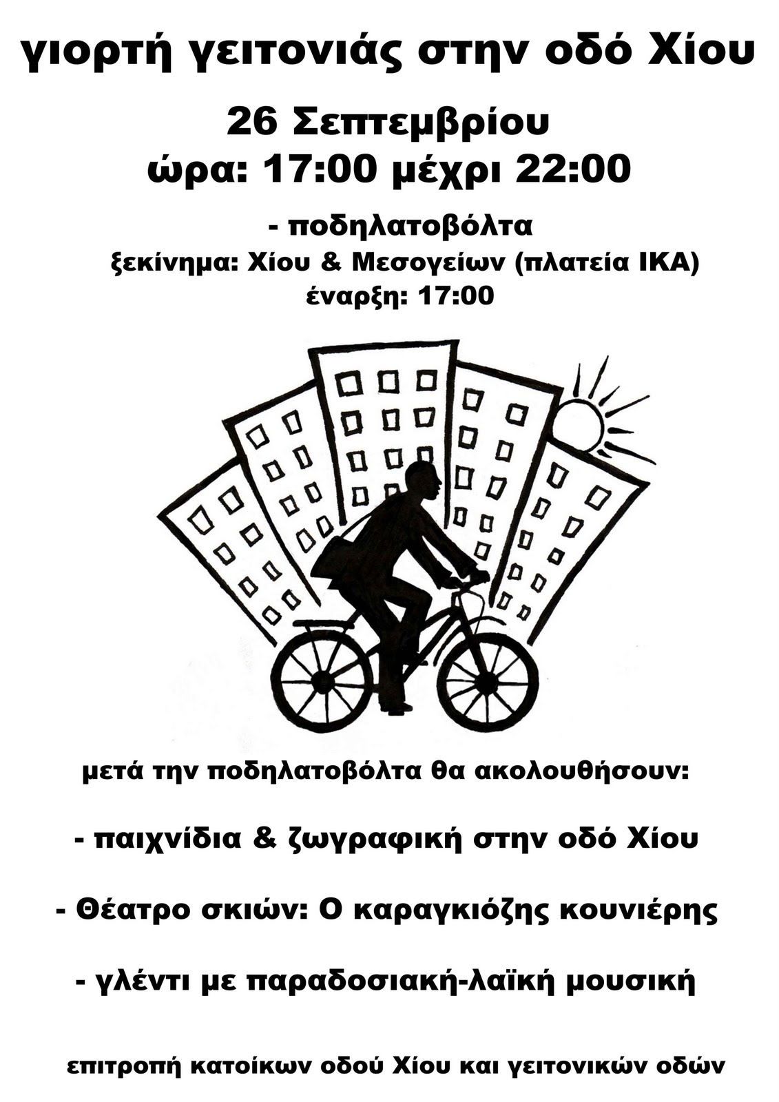 Στα πλαίσια της εκδήλωσης "Γιορτή γειτονιάς στην οδό Χίου" η ανοιχτή συνέλευση κατοίκων Αγίας Παρασκευής διοργανώνει ποδηλατοβόλτα στην περιοχή, την Κυριακή 26 Σεπτέμβρη.