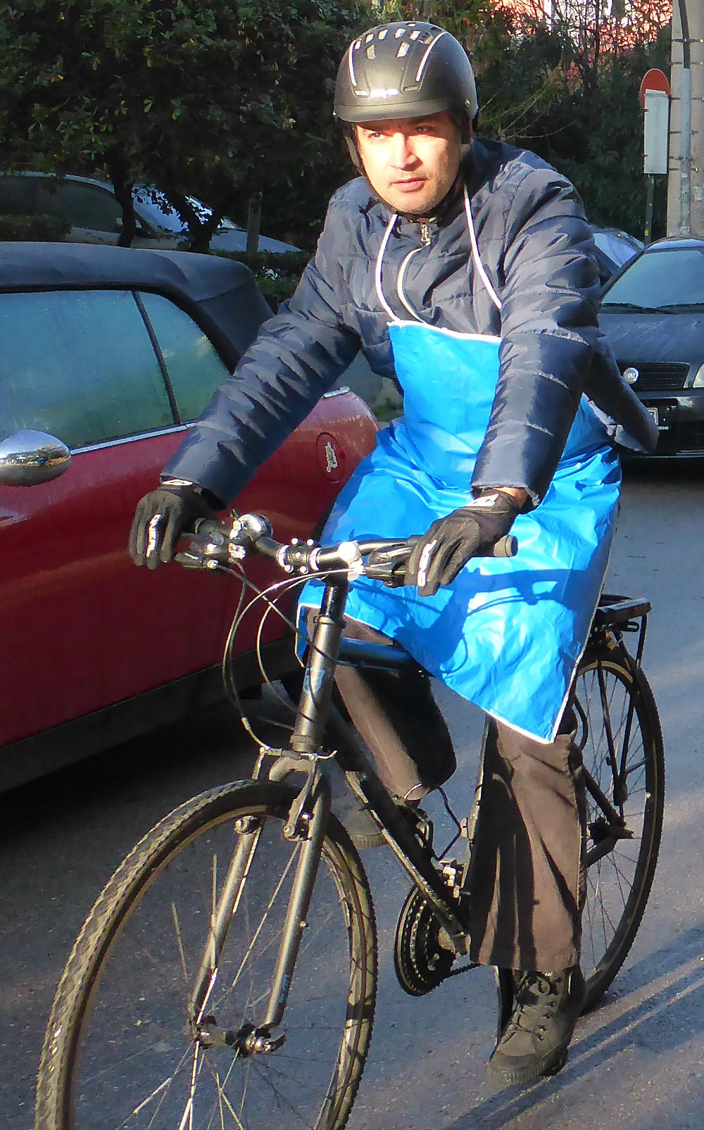 Και μια ΒΑΣΙΚΗ σημείωση ακόμα, όλα αυτά τα ειδικά (πόντσο ή ποδιά ή ότι άλλο) έχουν νόημα αφού πρώτα έχουμε φορέσει ΣΩΣΤΑ ΦΤΕΡΑ στο ποδήλατό μας. Έτσι όπως σε βλέπω στην φωτο.... είναι δώρο-άδωρο.... Γλιτώνεις από τα νερά της βροχής και θα τρως όλα τα απόνερα / λασπόνερα που είναι μάλλον χειρότερο. Και όταν λέω ΣΩΣΤΑ φτερά, εννοώ φτερά αρκετά φαρδειά για τα ελαστικά που φοράμε και καλά στηριγμένα με αντηρίδες.....
