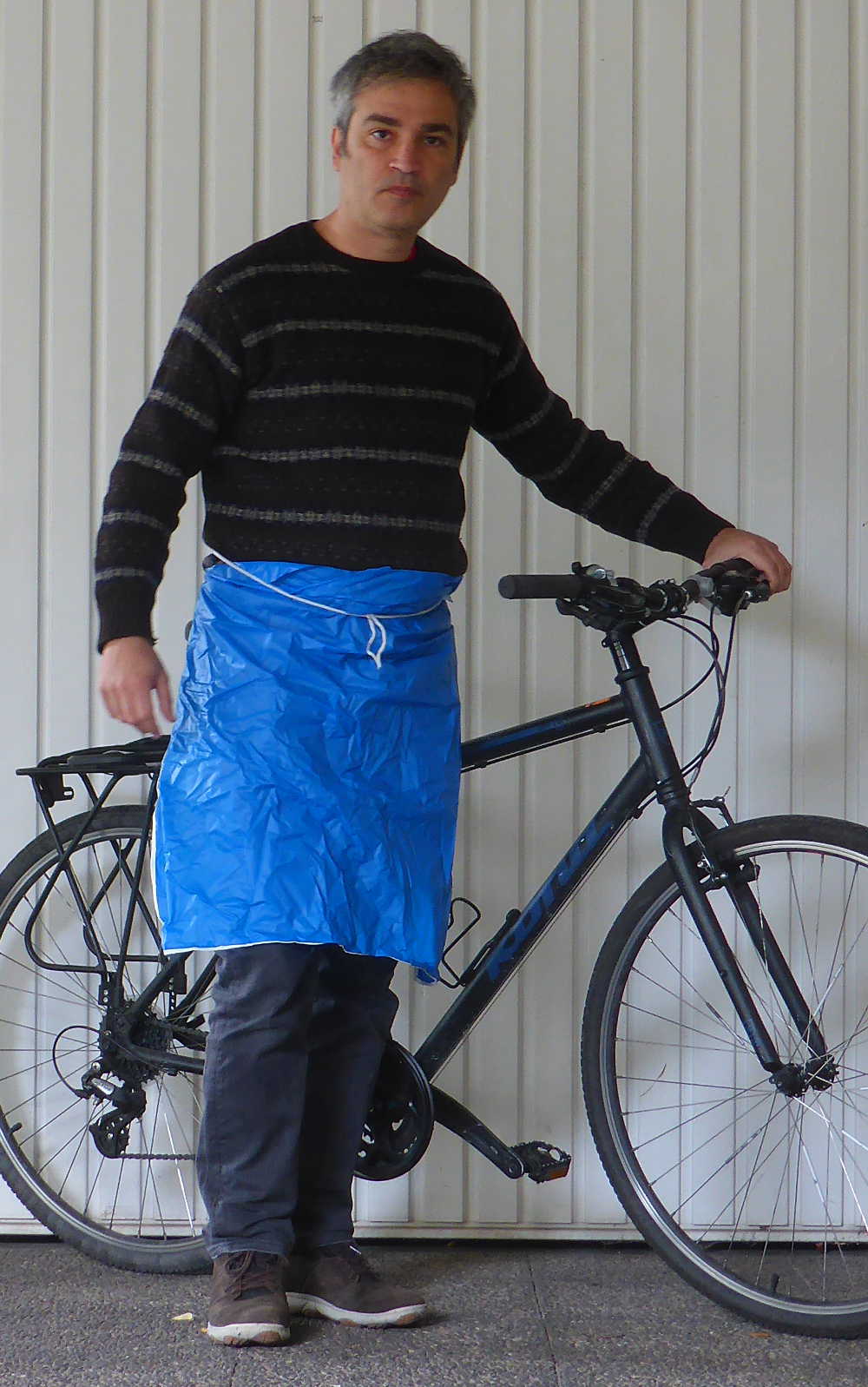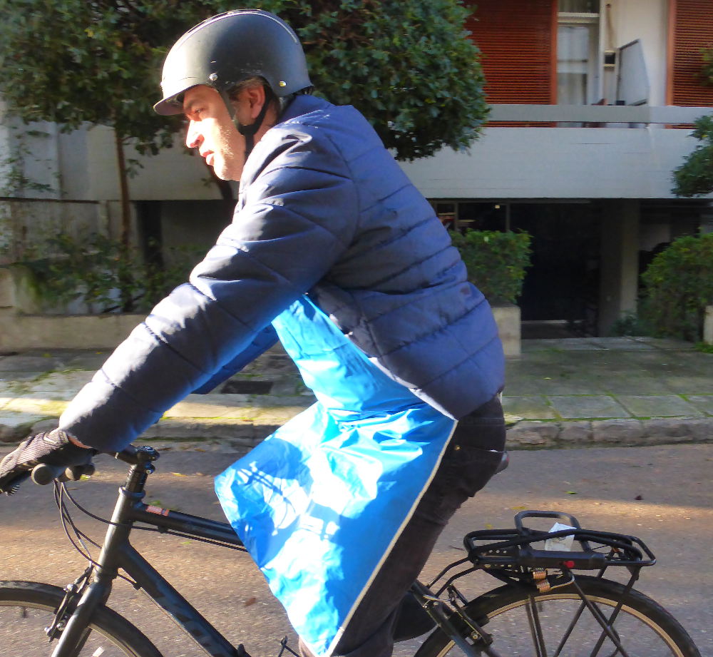 Ωραία η ιδέα... Εγώ έχω δει κατι τέτοιο https://www.rainlegs.com/en/home που είναι κάπως πιο "κομψό" αλλά και η ποδιά μια χαρά είναι.. Πουλάνε κατι νάυλον ποδιές στη λαική με 2-5 ευρώ αν δεν θέλει καποιος να τη φτιάξει μόνος .. Είναι και χρωματιστές!